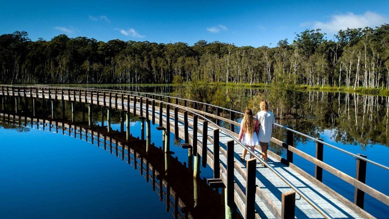 Visitors to the Bellingen seaboard have the opportunity to walk the 1.2km Urunga Boardwalk. Sections are upgraded with eco-friendly recycled decking that sits above the aquatic life of the lagoon.
